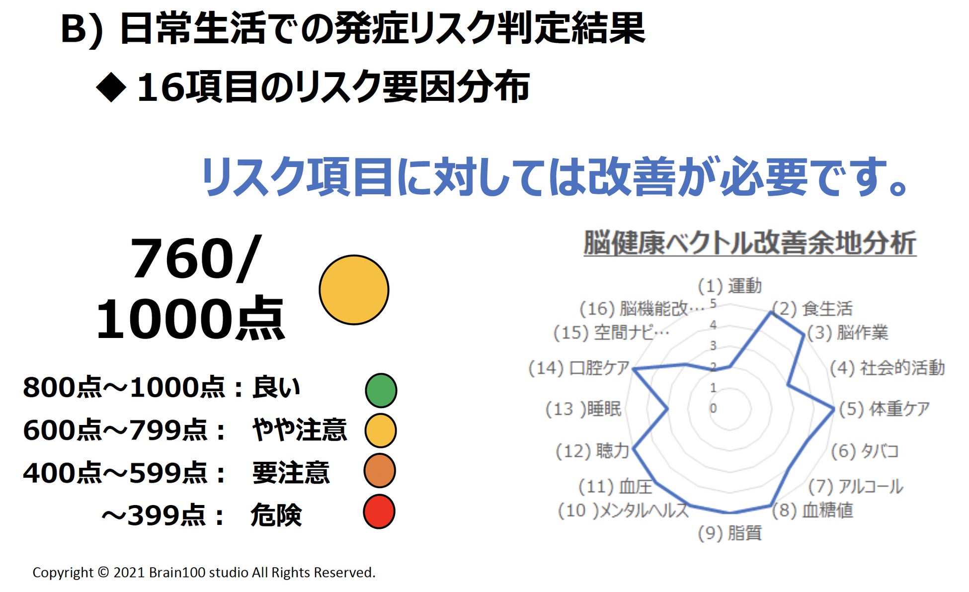 - 脳健康スコア(16項目の発症リスクをスコアしたもの。見える化されることで改善ポイントが明確化)