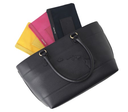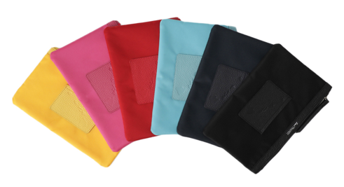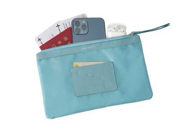 軽くて扱いやすいナイロン生地に、ポケットや取手部分をレザーであしらった6色のトラベルポーチ。マチのないシンプルなデザインのため、バッグの中がすっきりとまとまります。