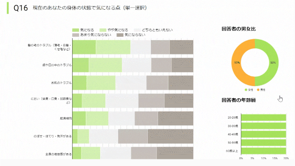 通常2ヶ月かかる大規模な定点調査を僅か5分で確認することが可能で、聴取したアンケートデータをグラフ化して実装しているため、専門的な知識や専用ツールは不要です。ブラウザ上で見たいデータを探してクリックするだけ。年代や性別、年収などのターゲットとする属性情報での絞り込みもクリック1つで完了します。
