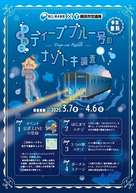 新江ノ島水族館(所在地:神奈川県藤沢市、館長:崎山 直夫)と横浜市交通局(所在地:神奈川県横浜市)は、3月7日(金)より横浜市営地下鉄を利用して謎解きが楽しめるコラボレーションイベント「潜水列車 ディープブルー号のナゾトキ調査」を開催します。