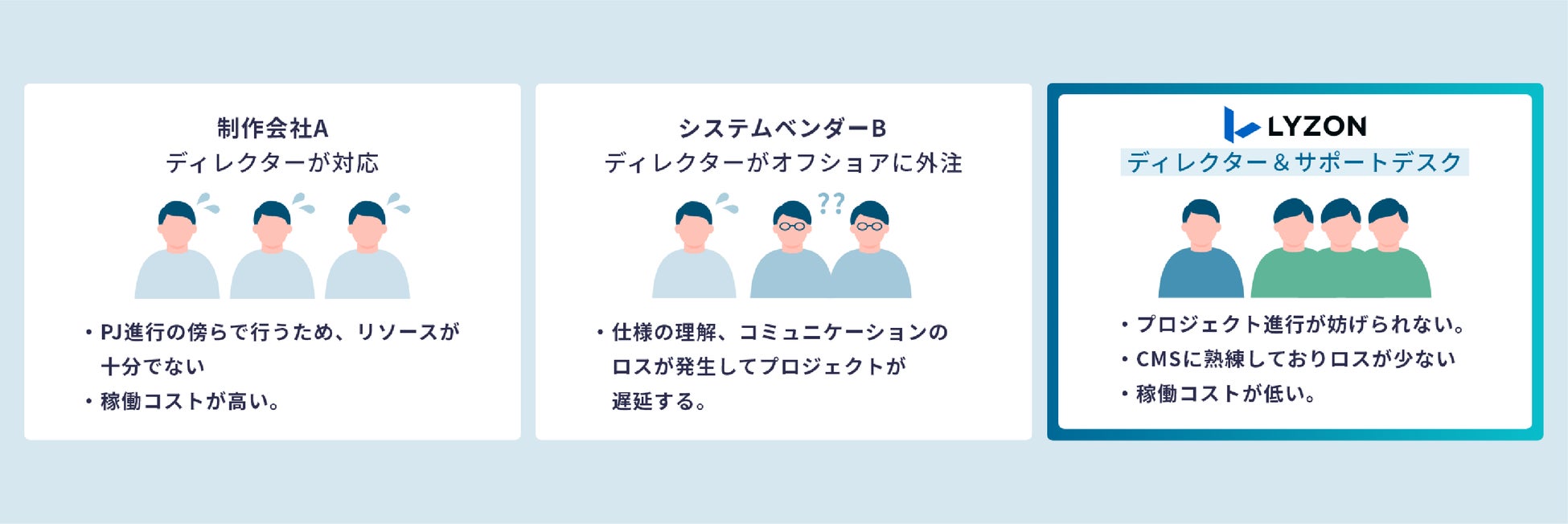 株式会社LYZONは、Webサイト運用のプロフェッショナルとしてお客様が抱える課題を解決し、より効果的なWebサイト運用を実現するためのサービスを提供し続けます。今後も幅広いニーズに対応できるサービスを展開してまいります。