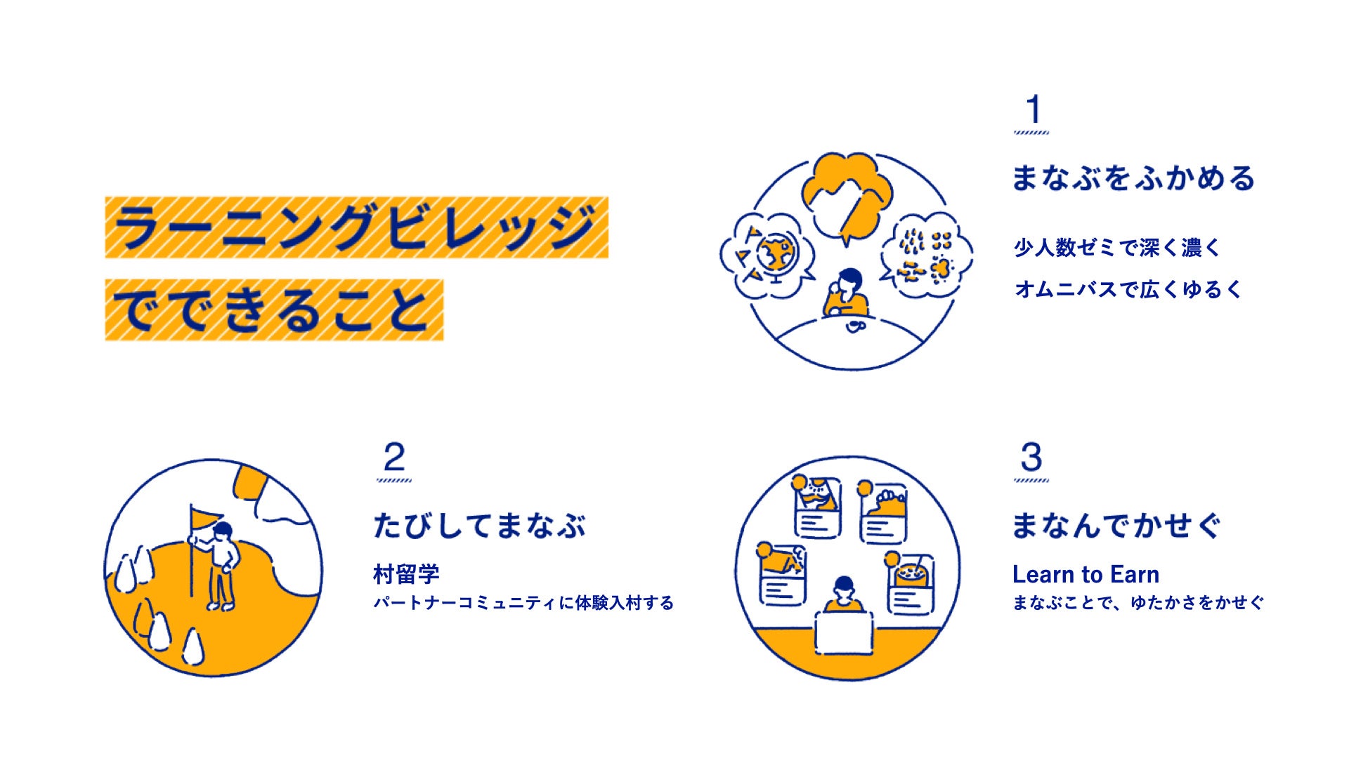 ラーニングビレッジの合言葉は「まなぶをふかめる」「たびしてまなぶ」「まなんでかせぐ」の3つです。多領域、多地域、多世代の実践者とこれらの活動をおこないながら、”みんなでつくる暮らし”に向けたナレッジを生み出していきます。