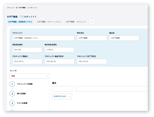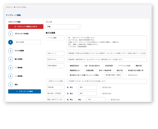テンプレートを登録し、仕様書などのドキュメント作成およびヒアリングを効率化します。工程表の作成も簡易的におこない、進捗遅れも見える化します。