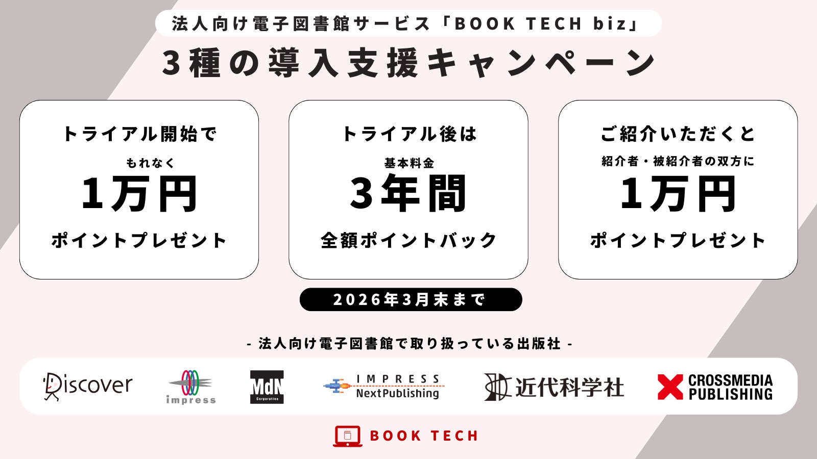 法人向け電子図書館サービス「BOOK TECH biz」出版社ラインナップ拡充を記念し、3種の導入支援キャンペーンを開始