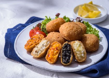 イカスミと魚介のうまみにチーズのコクが合わさった、リゾット 仕立てのライスコロッケ。口当たりの良いサックリした衣の中に、 程よい米の食感とイカスミならではのうまみとコクが楽しめます。 |