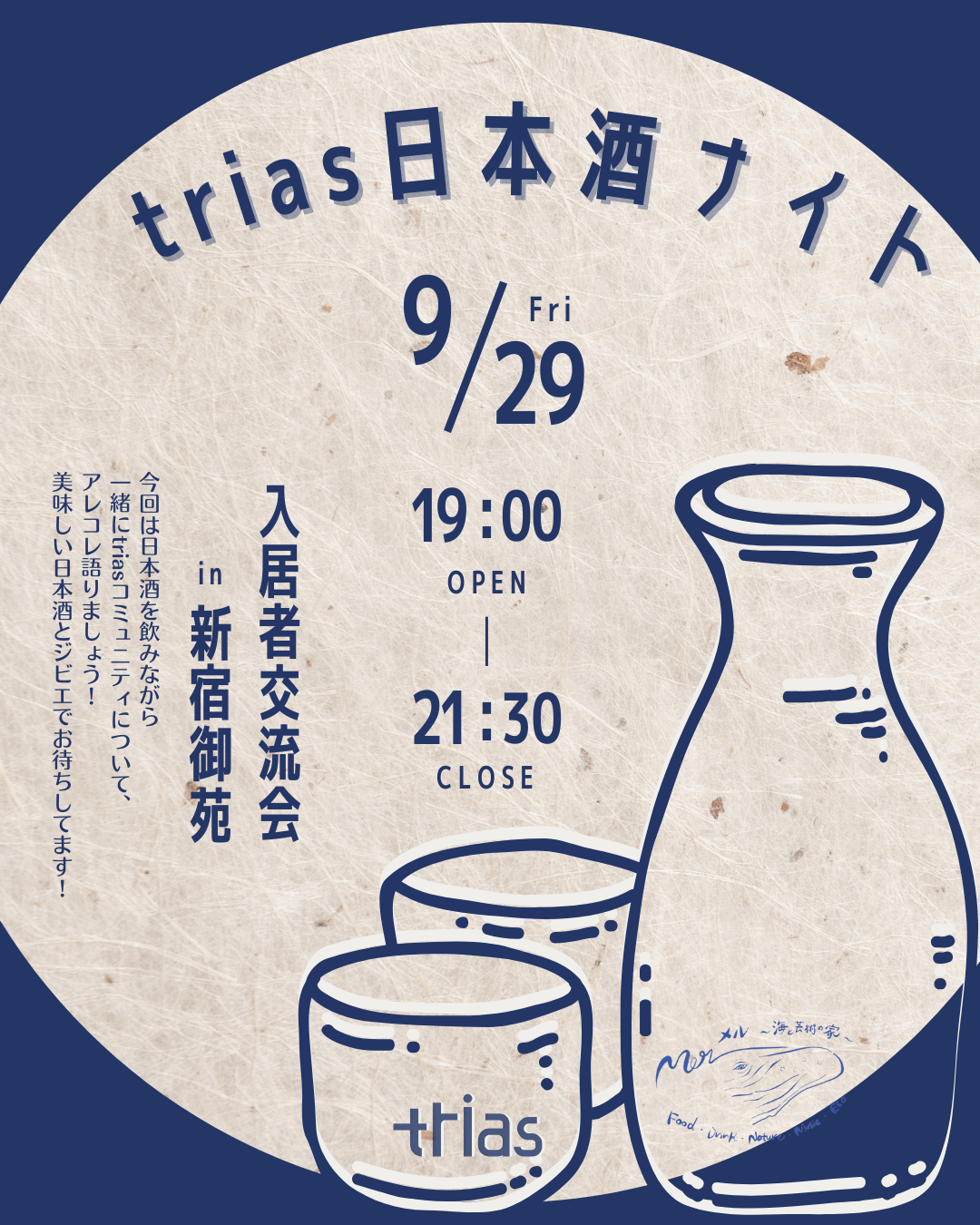 まったく新しいコミュニティ形成をしたいとかねてから様々な挑戦をしており、企業側が主体となるだけではなく、入居者と共に生み出す新しいtriasのコミュニティ活動として、今回は日本酒を飲みながら今後のイベントや施策について共に語れる会を開催いたします。