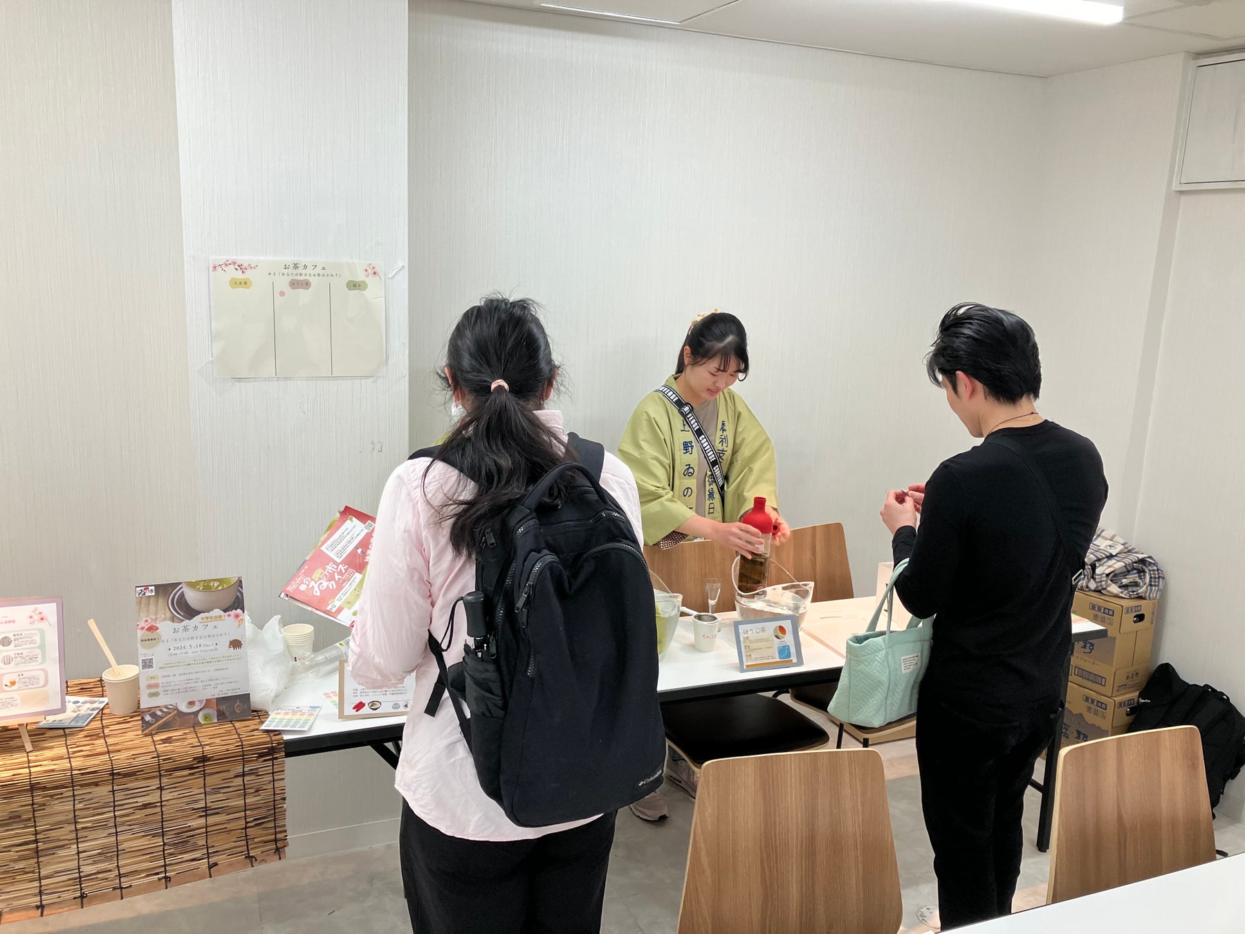 (上野商店街店舗の「茶の君野園」と学生団体おりがみが協働し、冷茶をお客様に提供)