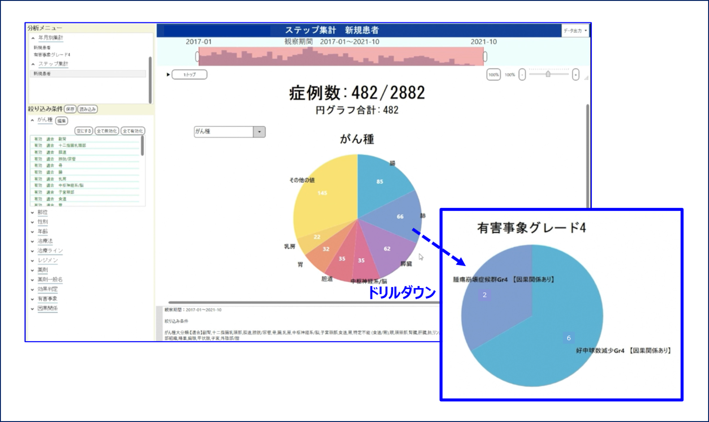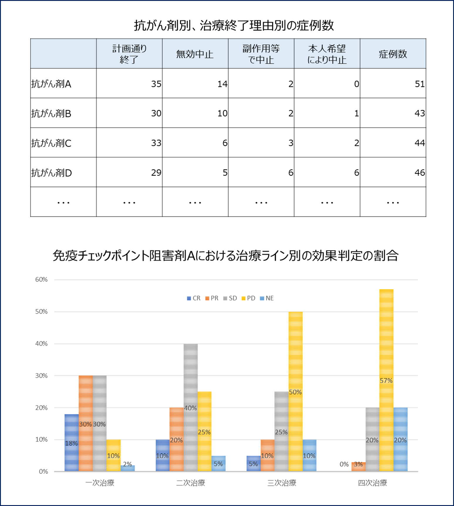 CyberOncology®へ搭載された集計アプリケーションにより、CyberOncology®のデータベースから自医療機関内の治療成績や有害事象情報等の診療データを集計・図式化することが可能です。これにより、自医療機関内での治療成績の可視化による医療実態の把握や有害事象情報等の可視化による医療安全の向上を支援します。