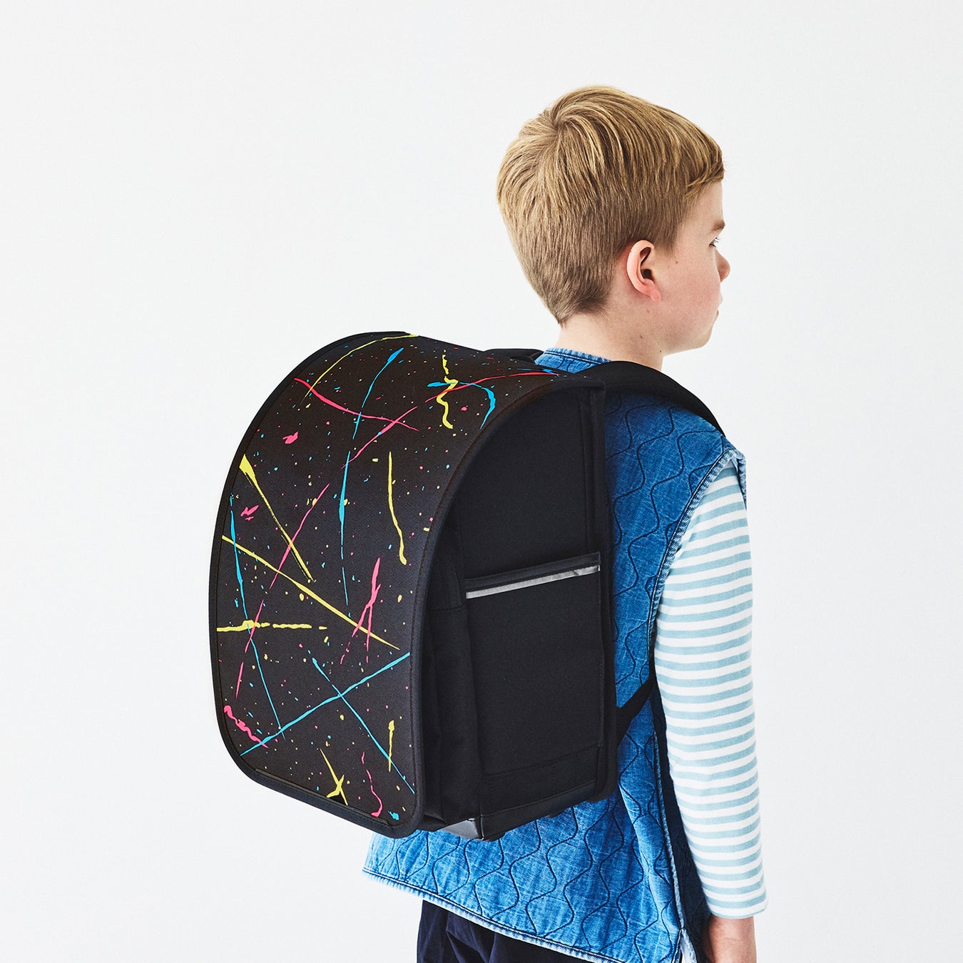 アウトドア好きなパパが、親子の実体験から着想した「自由なランドセル」。 軽量950gのリュック型に加え、新発想の「上びらき」や「きせかえフラップ」など、「常識にとらわれず、子どもの個性を大切にしたい」という願いが込められたランドセルです。