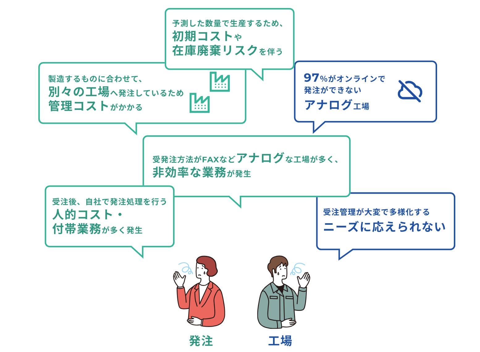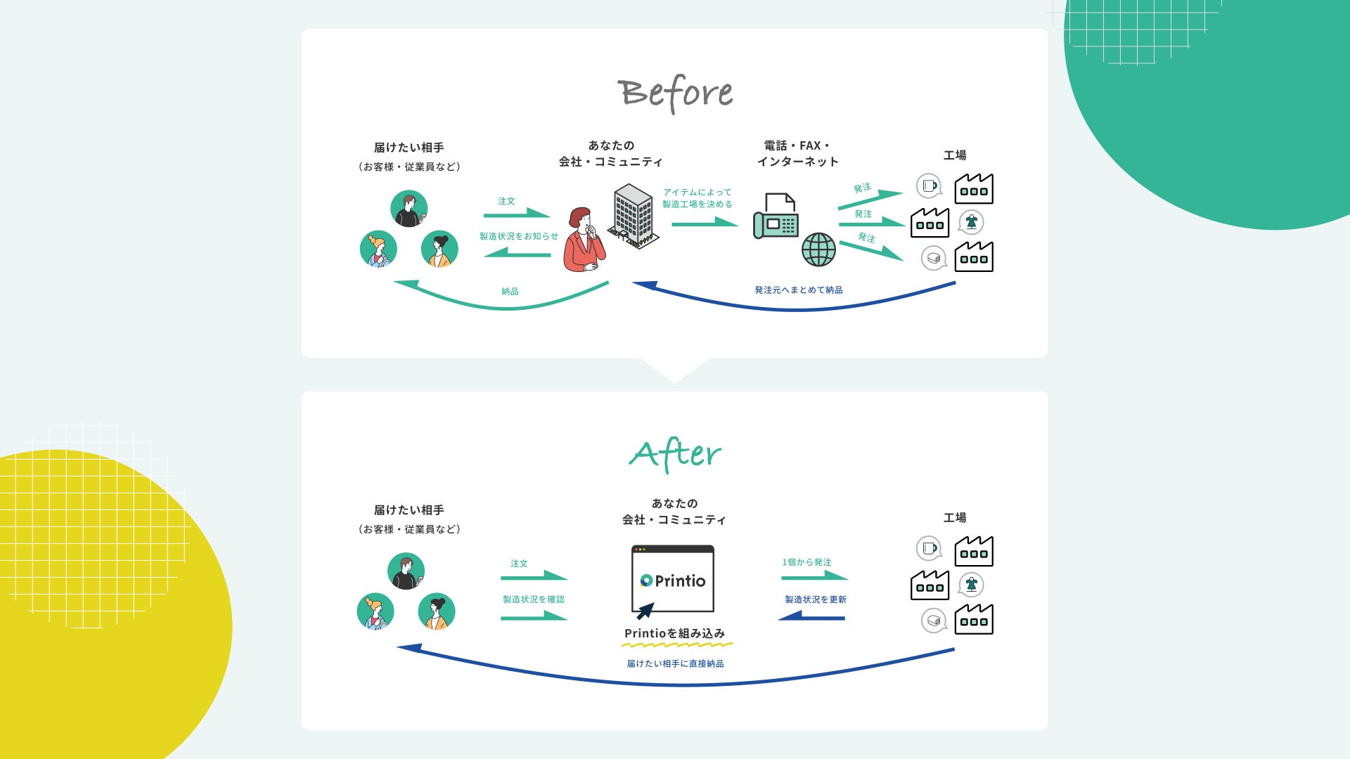 〈Printio〉は、事業者の課題を工場のアップデートで解決するFactory as a Serviceです 。工場のアップデートを進めながら、事業者のビジネスに組み込めるものづくりサービスを提供することで「ものづくりの民主化」 を進め、ものづくり業界の大量生産による環境課題の解決、在庫のない社会の実現を目指しています。