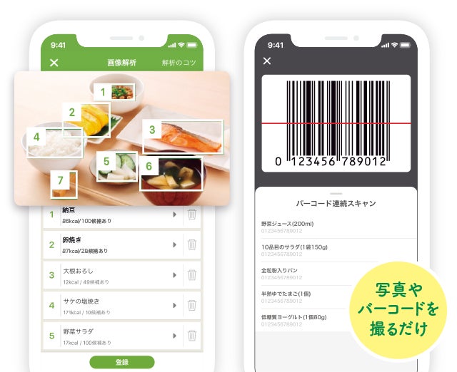 食事やバーコードを撮るだけでカロリーや栄養素が表示され、自身に合った目標摂取エネルギーや各種栄養素の過不足が一目でわかる、あらゆるライフステージの食の課題と向き合う食事管理アプリです。