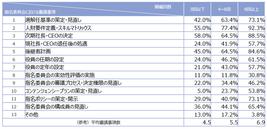 図4の指名委員会における審議事項を指名委員会の開催回数で分けた企業群でみると、4回以上の企業群では「選解任基準の策定・見直し」「人材要件定義・スキルマトリックス」といった割合が高くなるとともに議論が後継者計画に及ぶなど、運用面でより「実質」の議論が増える傾向にある(表1)。