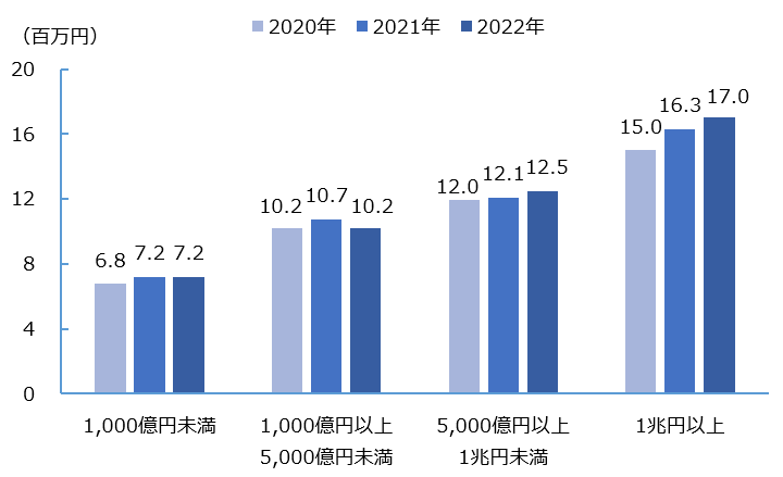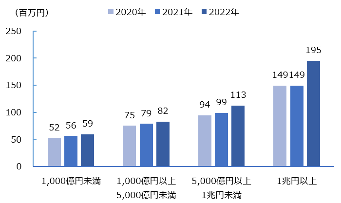 直近3年間連続して本サーベイに参加している企業群において、2022年の社長の総報酬額(中央値)は8,093万円であった。時価総額別(「1,000億円未満」、「1,000億円以上5,000億円未満」、「5,000億円以上1兆円未満」、「1兆円以上」の4つの企業群)の推移をみると、概ね報酬額は増加の傾向を示した(図7)。特に「1兆円以上」の企業群では1億9,500万円となっており、前年比30.7%と大きく増加した。