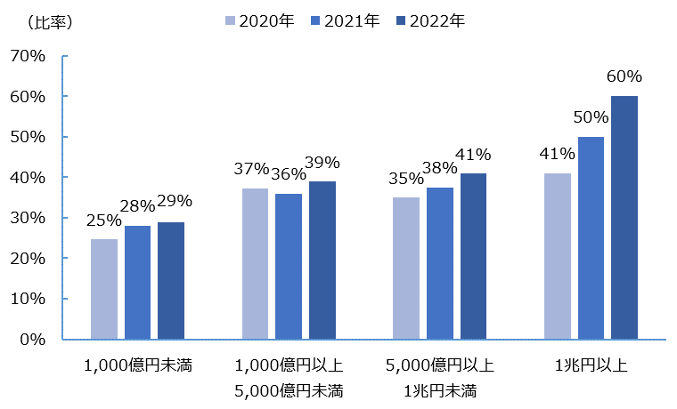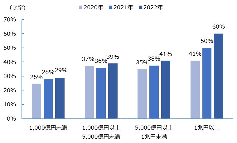 報酬額が増加した要因の1つに、報酬ミックスにおける変動報酬比率の上昇が考えられる。総報酬額に対する変動報酬額(短期インセンティブと中長期インセンティブの和)の比率をみると、「1兆円以上」の企業群においては直近3年間で19ポイントと大きく増加しており、それ以外の時価総額の企業群においても比率は概ね上昇していた(図8)。