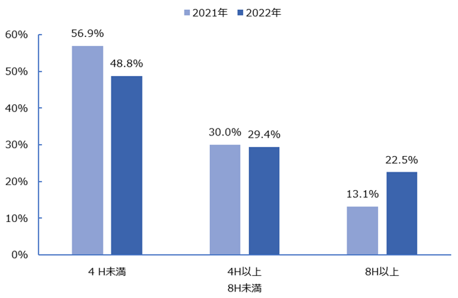 指名委員会の年間開催回数・時間をみると、開催回数が4回以上の企業の割合は56.9%(前年比11.8ポイント増)となっており、8時間以上開催している企業の割合は22.5%(同9.4ポイント増)と増加傾向にある(図1、2)