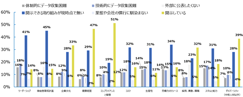 本サーベイ参加企業における人的資本の開示状況をISO30414基準*の各種領域に合わせて確認すると、「コンプライアンスと倫理」「健康経営」といったリスクマネジメントに関する領域での開示が進む一方、「リーダーシップ」「生産性」「スキルと能力」といった企業価値向上に関する領域での開示では「開示できる取り組みが現時点で無い」がいずれも理由の最多であった(図6)。