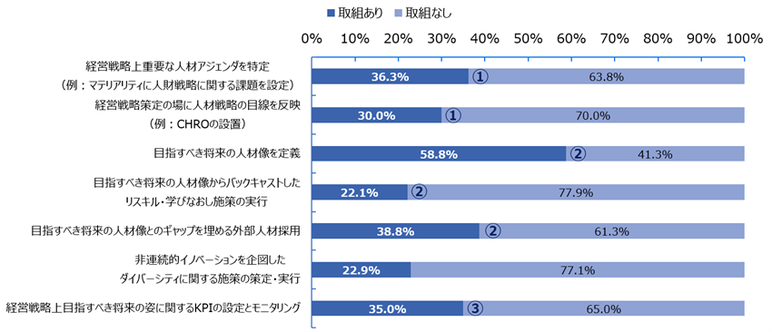 人材版伊藤レポートで掲げられている経営戦略と人材戦略の連動について、本サーベイ参加企業の具体的な取組状況をみると、経営戦略上で重要な人材アジェンダを特定する企業や、人材戦略の目線を反映する企業は30%程度となっている(図5①)。およそ60%の企業が目指すべき人材像を定義できていると回答した一方、その目指すべき人材像に紐づく育成施策や採用施策を打ち出せている企業はそれぞれ約20%、約40%となっている(同②)。また、人的資本経営の実効性を担保するために重要となる指標(KPI)の設定状況をみると、経営戦略上目指すべき将来の姿に関するKPIの設定とモニタリングを行っている企業は35%となっている(同③)。