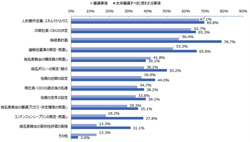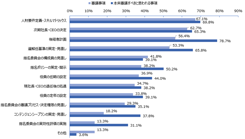直近2年連続で指名領域のサーベイに参加した193社をみると、90.7%(前年比51.3ポイント増)の企業がスキルマトリックスを作成済である(図3)。また、指名委員会において「人財要件定義・スキルマトリックス」や「次期社長・CEOの決定」を審議している企業は6割超となっている(図4)。コーポレートガバナンス・コード改訂等を背景に「形式」が整う中、「実質」を意識して指名委員会運営の高度化が進んでいる。他方で「本来審議すべき事項」との差を見ると、「後継者計画」「選解任基準」「指名ポリシーの策定・開示」「コンテンジェンシープランの策定・見直し」「指名委員会の実効性評価の実施」において差が大きくなっており、今後こうした議論が進むことが期待される。