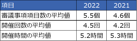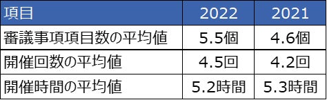 直近2年連続で「報酬委員会を設置している」と回答した企業237社をみると、報酬委員会の開催回数の平均値は4.5回(前年比0.3回増)、合計開催時間の平均値は5.2時間(同0.1時間減)であった(表2)。