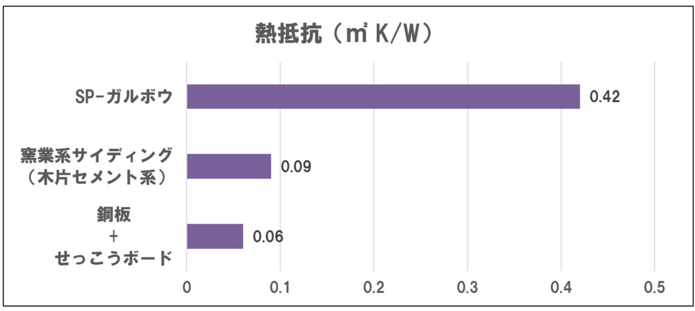 熱抵抗値で比較すると、鋼板とせっこうボードを使用した場合0.06㎡K/Wとほぼ断熱性はありません。窯業系サイディングでは0.09㎡K/W、断熱材が含まれたSP-ガルボウでは0.42㎡K/Wです。(熱抵抗は数値が大きいほうが断熱性に優れています)