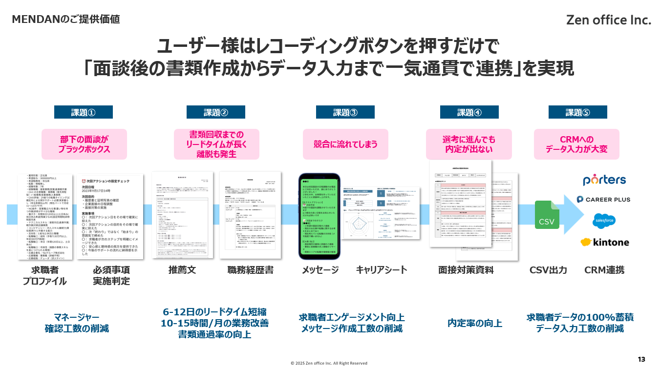 面談後の書類作成やデータ入力に時間がかかると、書類回収や次回面談への移行が遅れ、結果として決定までの歩留まりが下がります。MENDANは、面談の録音→自動可視化→各種書類の自動生成→CSV出力→CRM連携までを一連で支援し、業務時間の大幅な短縮とKPI(重要指標)の改善を同時に実現します。