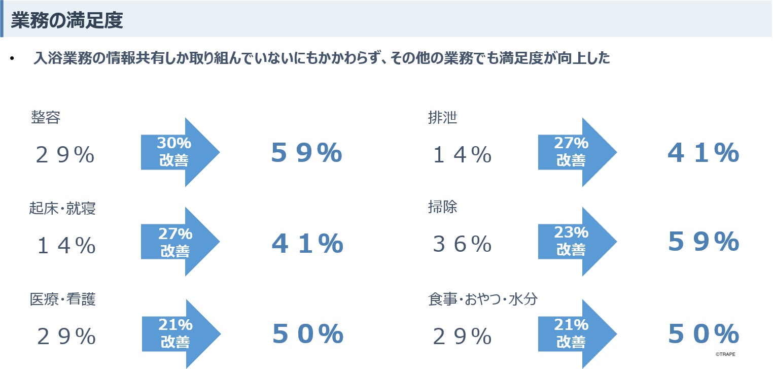 入浴業務における課題を改善することで、業務効率化だけでなく、入浴ケアの質が向上や他業務における業務満足度の向上、職員同士が対話する習慣化を生み出した取り組み