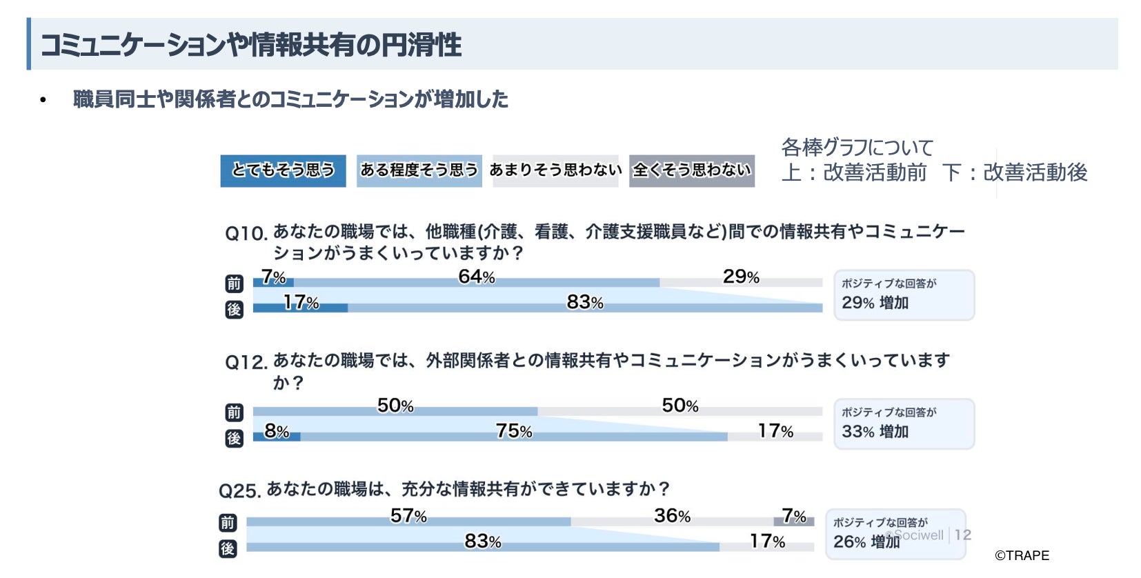 介護における生産性向上ガイドライン作成など、2017年から介護分野の生産性向上のためのさまざまな国の施策づくりで中心的な役割を担い、ウェルビーイングに溢れた介護事業所を創出するために「生産性向上」「働きがい向上」「リーダー育成」の3つを一度に実現することができる生産性向上伴走支援サービス「Sociwell(ソシウェル)」を展開している株式会社TRAPE(本社:大阪府大阪市、代表取締役社長:鎌田大啓)は、一般社団法人日本福祉用具供給協会中国支部広島県ブロック様より令和5年度介護ロボットの開発・実証・普及のプラットフォーム事業相談窓口における業務アドバイザーを受託し、広島県内で介護ロボットを導入しようとする3つの介護事業所に対して伴走支援を実施し、成果を生み出すことができましたのでご報告させていただきます。