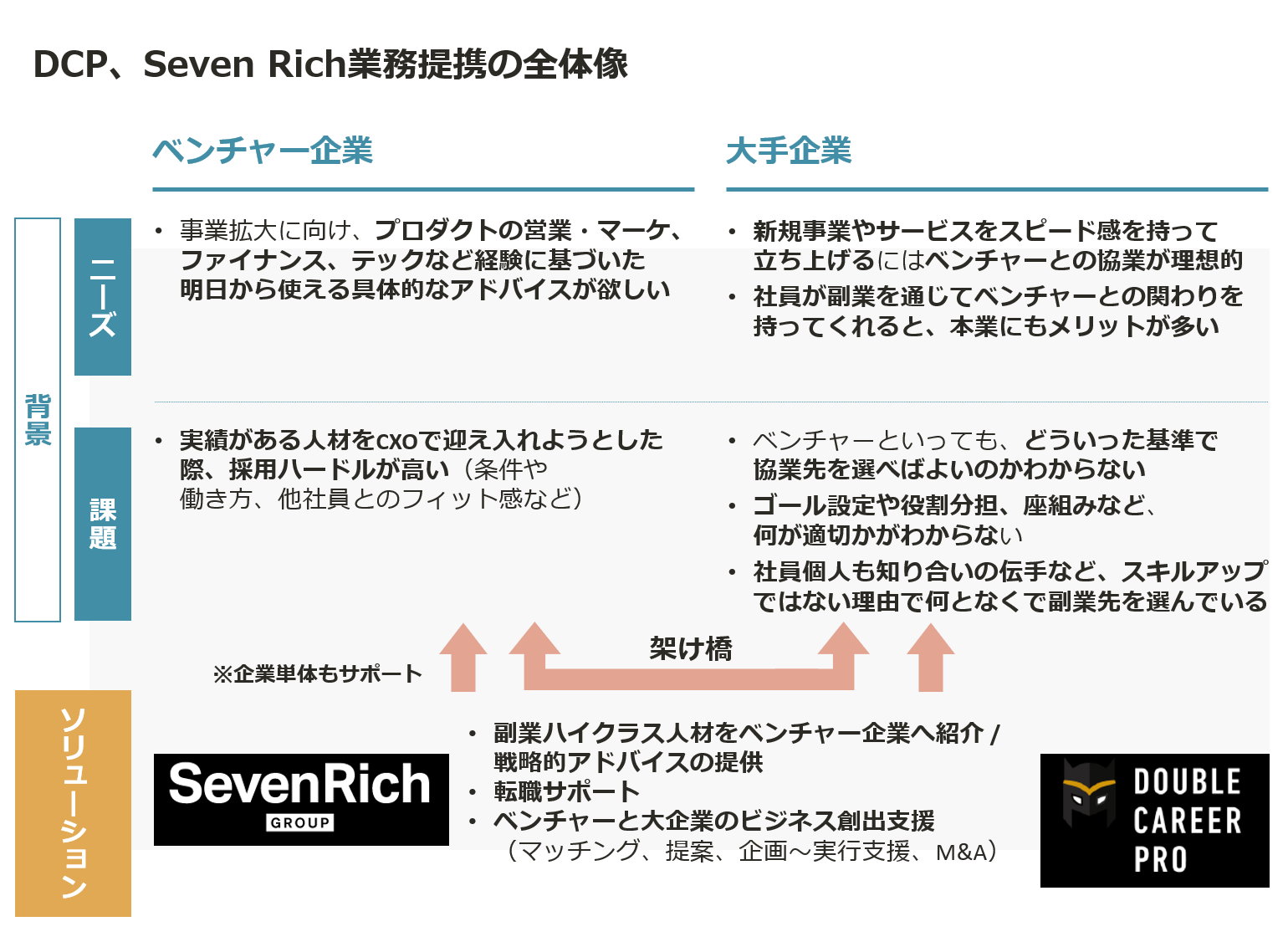 このような状況を踏まえ、スタートアップを中心とした企業の経営支援に強みを持つSeven Rich Groupは、大手企業の優秀な人材の能力の流動化「複業CxO」の輩出を通じて社会へのイノベーション創出を目指す、ダブルキャリア・プロとの業務提携を締結しました。