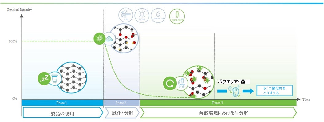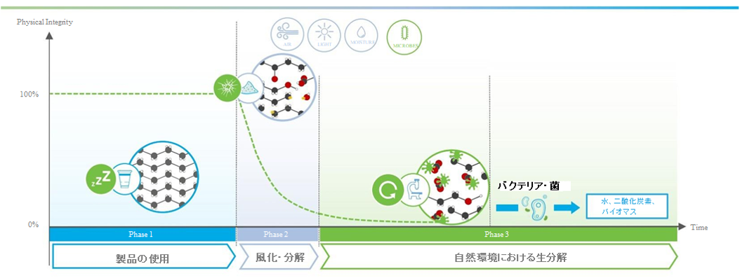 あれば通常のPE(ポリエチレン)やPP(ポリプロピレン)としてリサイクルが可能です。設計期間経過後、成形品の分解が始まります。PEやPPの炭素結合が切れることで低分子化していき、微生物による分解を経て、最終的には水と二酸化炭素、バイオマスに完全分解されます。独自技術により、この過程においてマイクロプラスチックが残ることがありません。