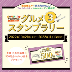 食欲の秋に関するイベントとして「グルメ3スタンプラリー」を実施いたします。楽天地ビル、錦糸町PARCO、アルカイースト、カルムガーデン錦糸町飲食店舗を対象に、1回の食事で税込600円以上利用されたお客様にスタンプを1つ押印、すべて異なるスタンプを3つ集めると、参加店舗で使える500円分のグルメ券をプレゼントする企画です。