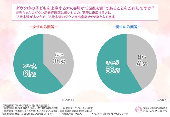 そこで、女性の方に「ダウン症の子どもを出産する方の8割が“35歳未満”であることをご存知ですか?」と質問したところ、約6割の方が『いいえ(61.4%)』と回答しました。