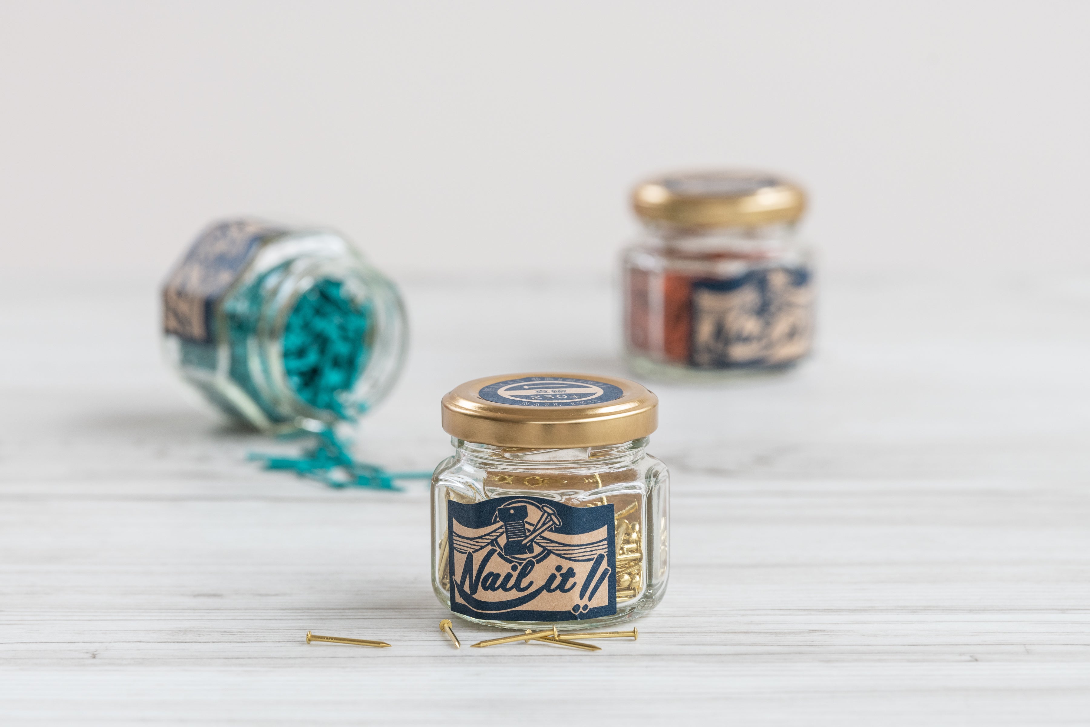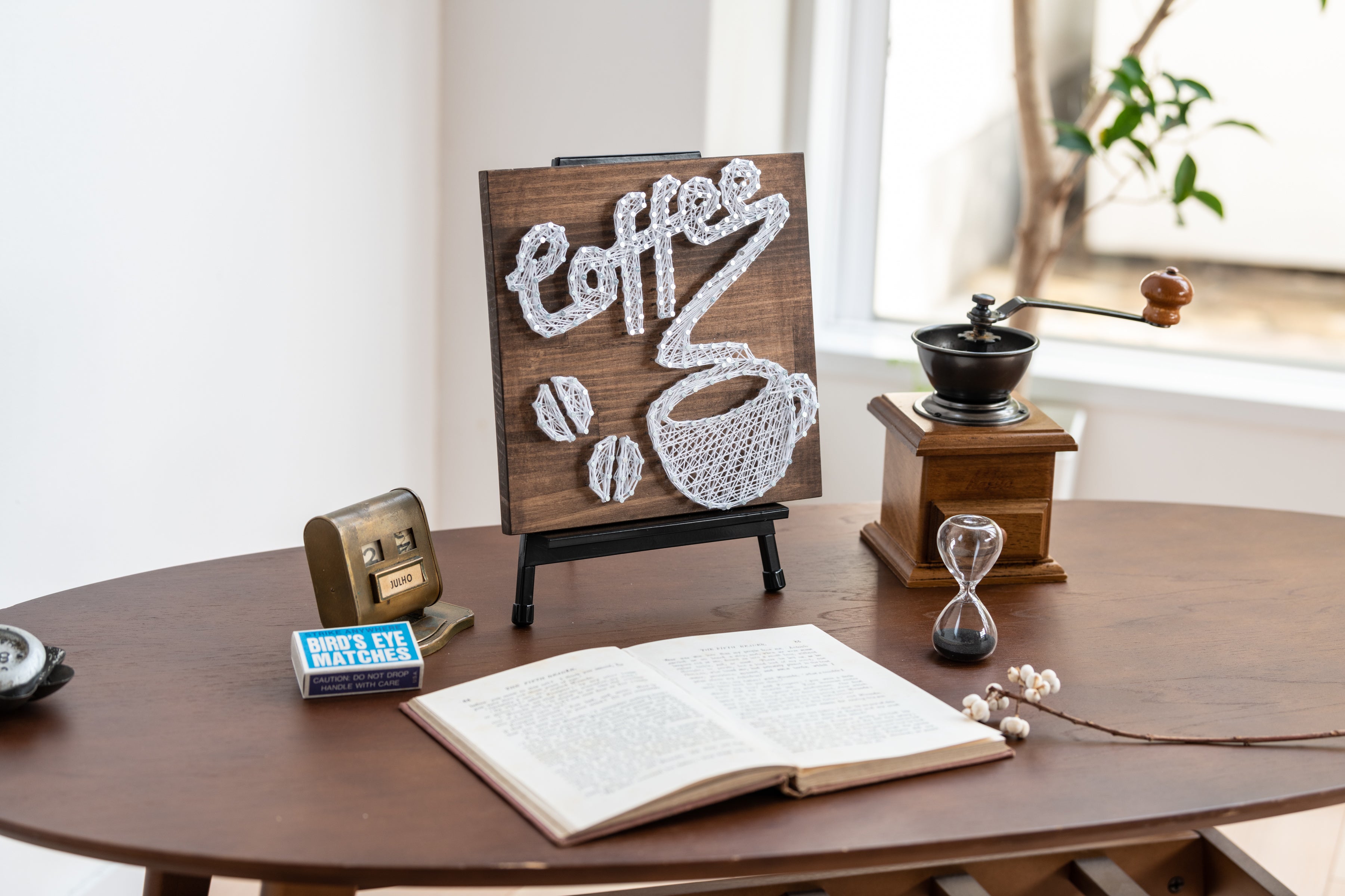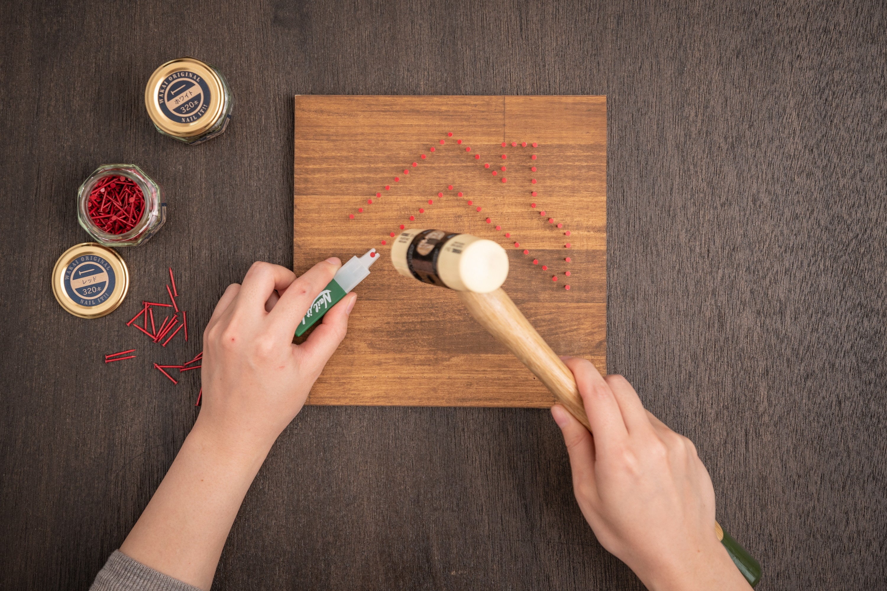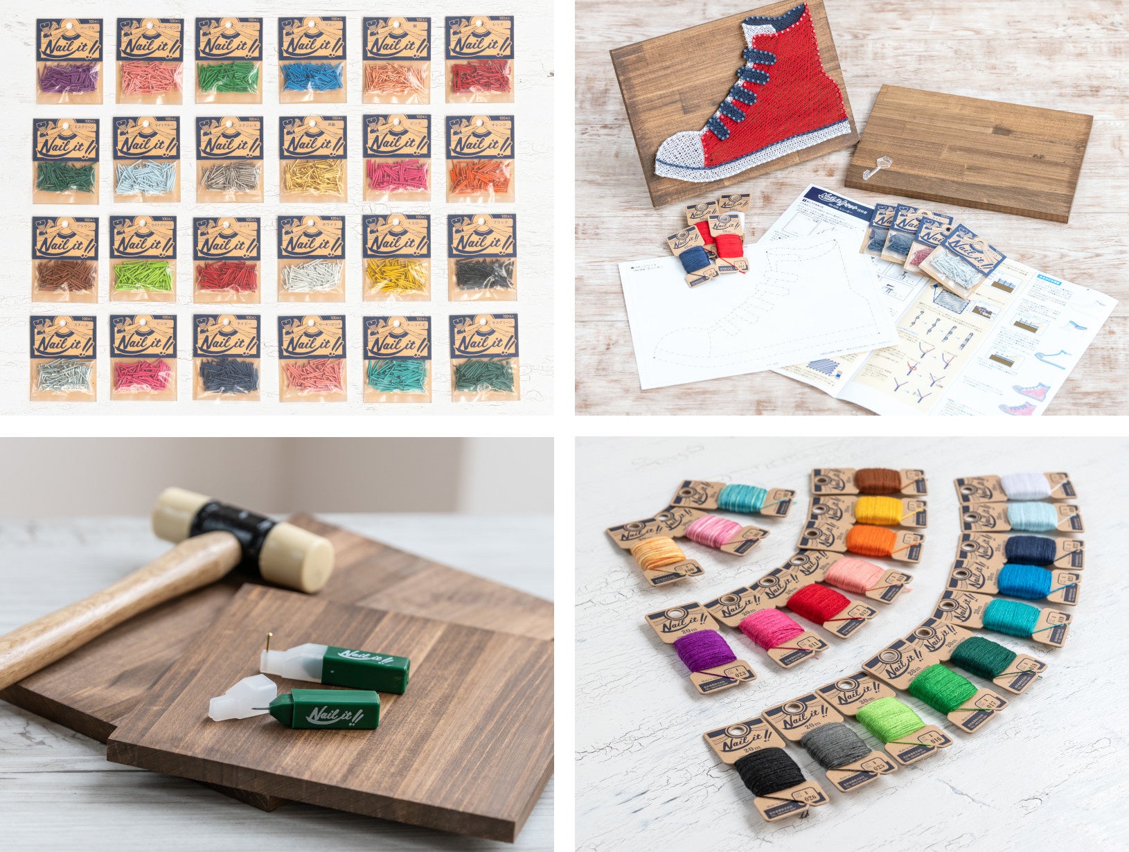 今までにないカラフルな釘や、釘を安全に打つための便利ツール、キット品など様々なアイテムを取り揃えています。板に釘を打ち込み糸をかけるだけなので、 大人から子供まで楽しめるのが特徴です。規則正しく糸をかけて美しい模様を描くものや、 結婚式のウェルカムボードなど、様々な形で日本に浸透してきています。