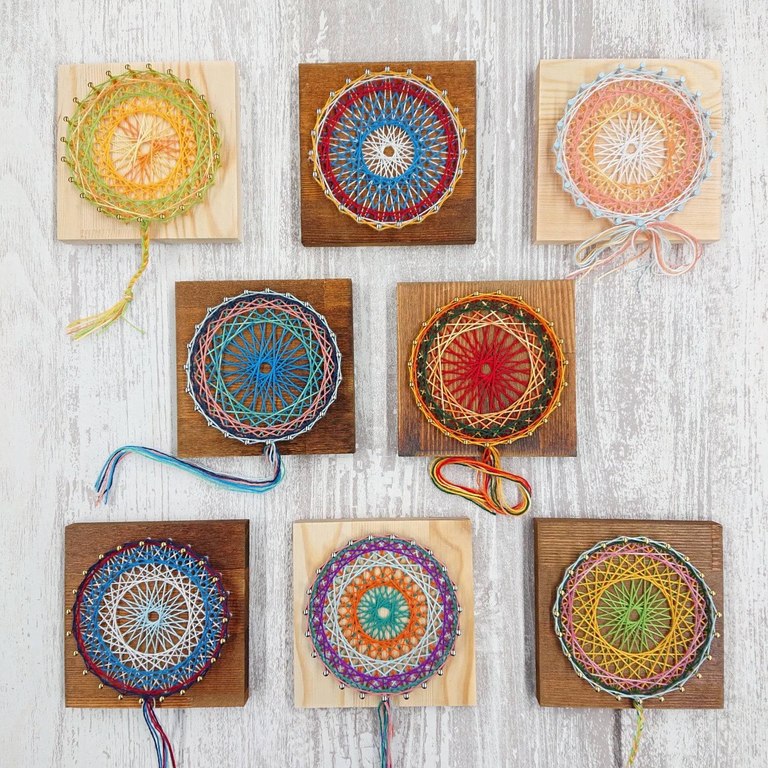大きさが異なる大・中・小の3枚の板が入ったお得なセットです。3つの糸かけ曼荼羅を楽しむことができます。