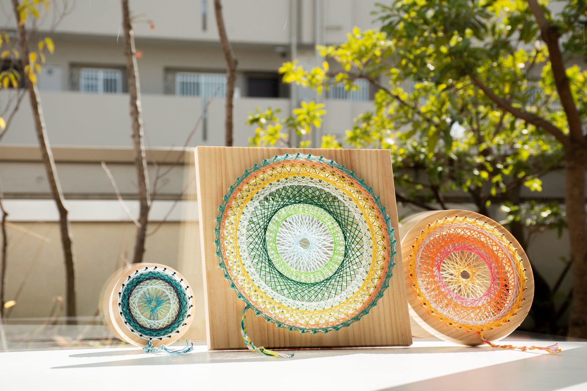 *糸かけ曼荼羅とは、板に釘を打ち込み、糸を規則正しくかけていくことで生み出される立体模様のアートです。