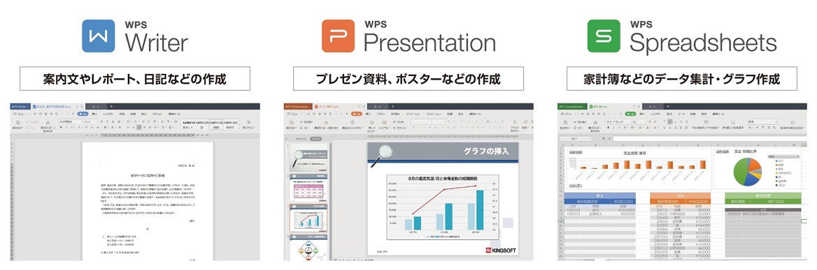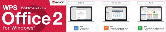 KINGSOFTの「WPS Office 2」はリモートワークで必須のMicrosoft Officeと高いファイル互換性を誇るオフィス・ソフト。今やパソコンユーザー必携となっているオフィスソフトですが、WPS Officeは Microsoft Officeに比べて圧倒的な低価格と高い信頼性で選ばれ続け、販売実績にもとづくBCN社「BCNランキング」の [オフィス互換ソフト分野] において11年連続 No.1 を達成しています。WPS Writer(Word互換・文書作成)、WPS Spreadsheets(Excel互換・表計算)、WPS Presentation(PowerPoint互換・プレゼンテーションスライド作成)から構成され、Microsoft Office 2007以降のファイル形式に対応し、同じ拡張子で閲覧・編集・保存が可能なので自宅での作業でも不便を感じることはありません。さらにWPS PDF(PDF 閲覧・加工)が加わり、1つのウィンドウで文書作成・表計算・スライド作成・PDF をタブで開くことができ、効率的な作業をサポートします。