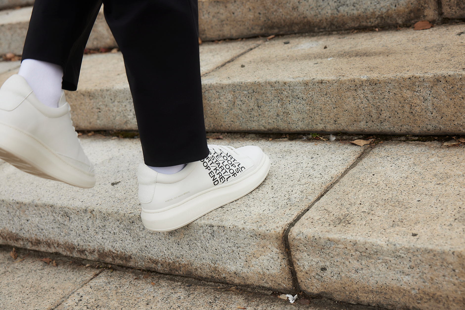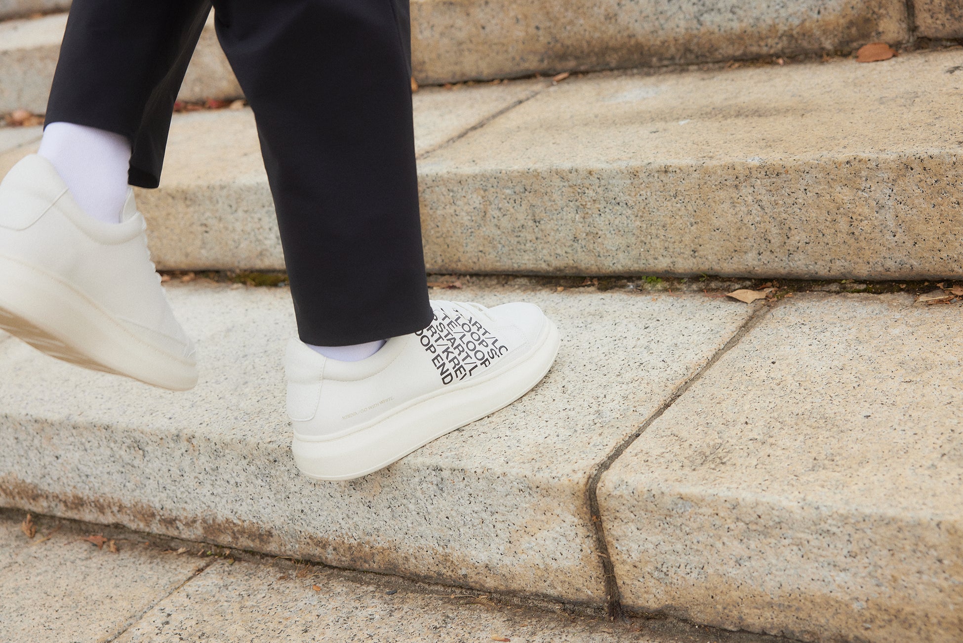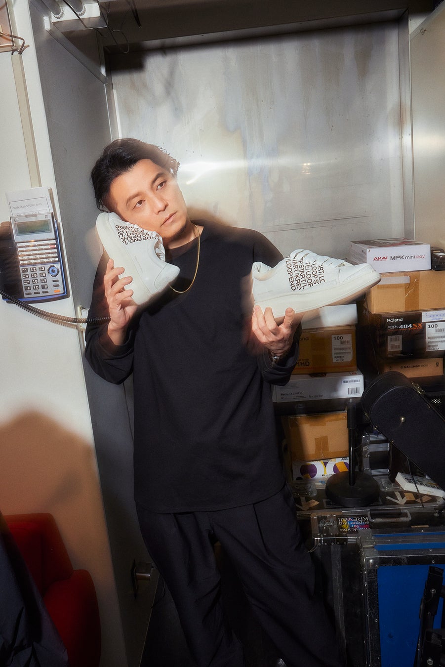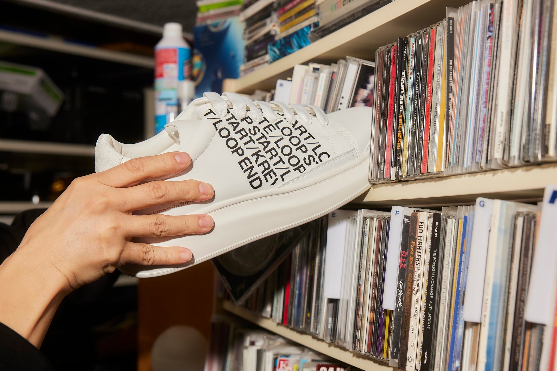 オリコン、billboard JAPANと共に週間ランキング1位をした「LOOP END / LOOP START」のジャケットデザインを、GO WITH WHITEのPOLARに落とし込みました。LOOP END / LOOP STARTのロゴはペイントなどではなく、他にはない新しい技巧で職人が1足ずつ圧着し、POLARのスニーカーにデザインを落とし込むことを実現。ブランドロゴはレーザーを使用しエッジを効かせ立体的に仕上げています。