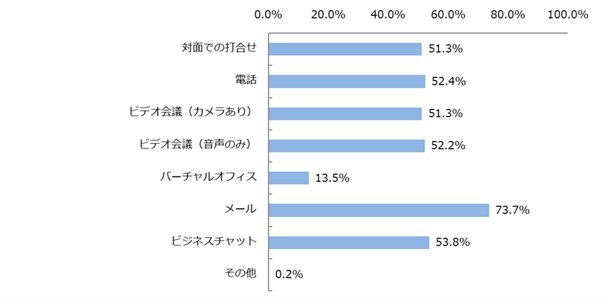 口頭でのコミュニケーション手段としては、「対面での打合せ」「電話」「ビデオ会議(カメラあり)」「ビデオ会議(音声のみ)」がそれぞれ50%程度。「ビジネスチャット(53.8%)」「バーチャルオフィス(13.5%)」も含め、オンラインツールの利用が一般化していることがうかがえます。