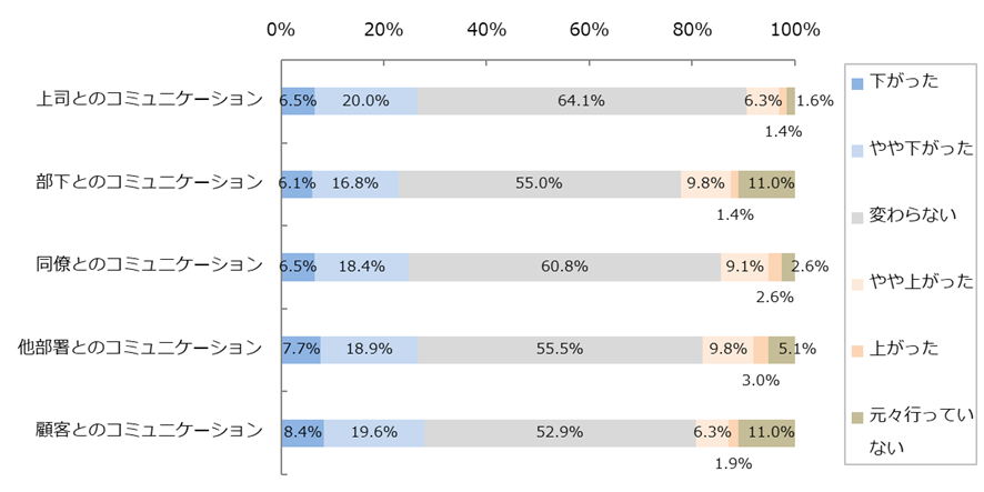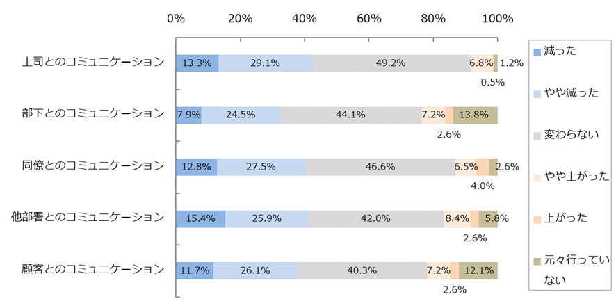 コミュニケーション量は全てのパターン(上司・部下・同僚・他部署・顧客)において、約4~5割の人が「変わらない」と回答。一方、全てのパターンで「減少」が「増加」を上回っており、全体としてのコミュニケーション量はコロナ前後で減少しています。