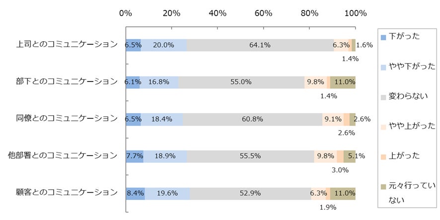 - コミュニケーションの量が減少していることに加え、コミュニケーションの満足度や仕事のパフォーマンスが低下したと思う人が増加