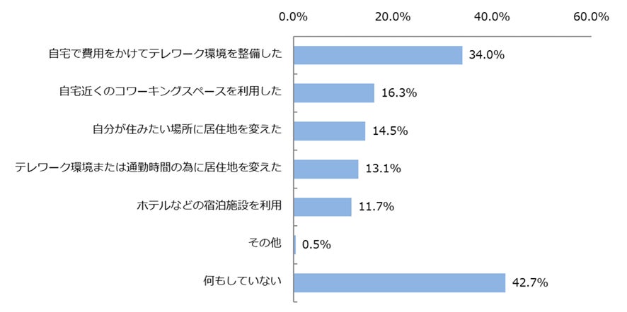 テレワークにおける働く場の工夫を「何もしていない」と回答したのは42.7%であり、約6割の人が何らかの工夫または環境整備を行っていることが判明。具体的な工夫としては「自宅のテレワーク環境整備(34.0%)」が最も多く、「コワーキングスペースの利用(16.3%)」「自分が住みたい場所に居住地を変えた(14.5%)」が続きました。