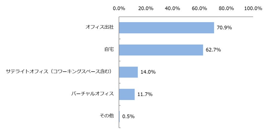 主な勤務地としてオフィス出社を選択(複数選択可)した人は70.9%にとどまり、約3割はオフィス出社以外が主な勤務地となっていることが判明。オフィス出社以外の選択肢としては、「自宅(62.7%)」「サテライトオフィス(14.0%)」に次いで、「バーチャルオフィス」を選択した人も11.7%存在します。