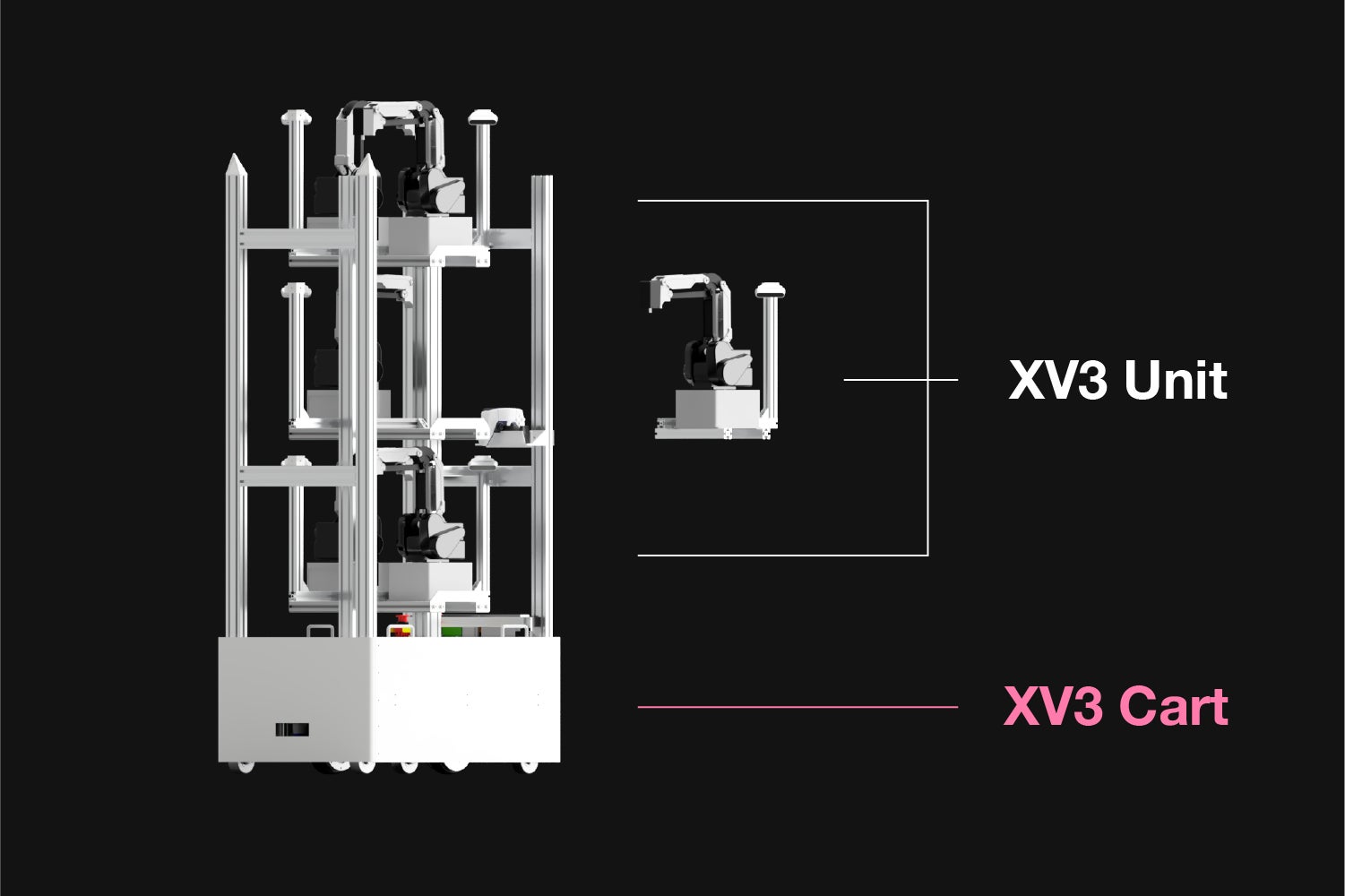 ロボットは、植物工場内を自動で走行する「XV3 Cart」と、データ収集用のセンサーや作業用ロボットアームを搭載した「XV3 Unit」の2つで構成されています。従来機では、お客様の植物工場の棚の段数に合わせて、ロボットを毎回カスタム設計する必要がありました。一方、「XV3」はロボット本体の設計を変更することなく、植物工場の棚の段数に合わせて1-5段で自由に高さを選択することができるので、短期間で様々な環境下への導入が可能になりました。