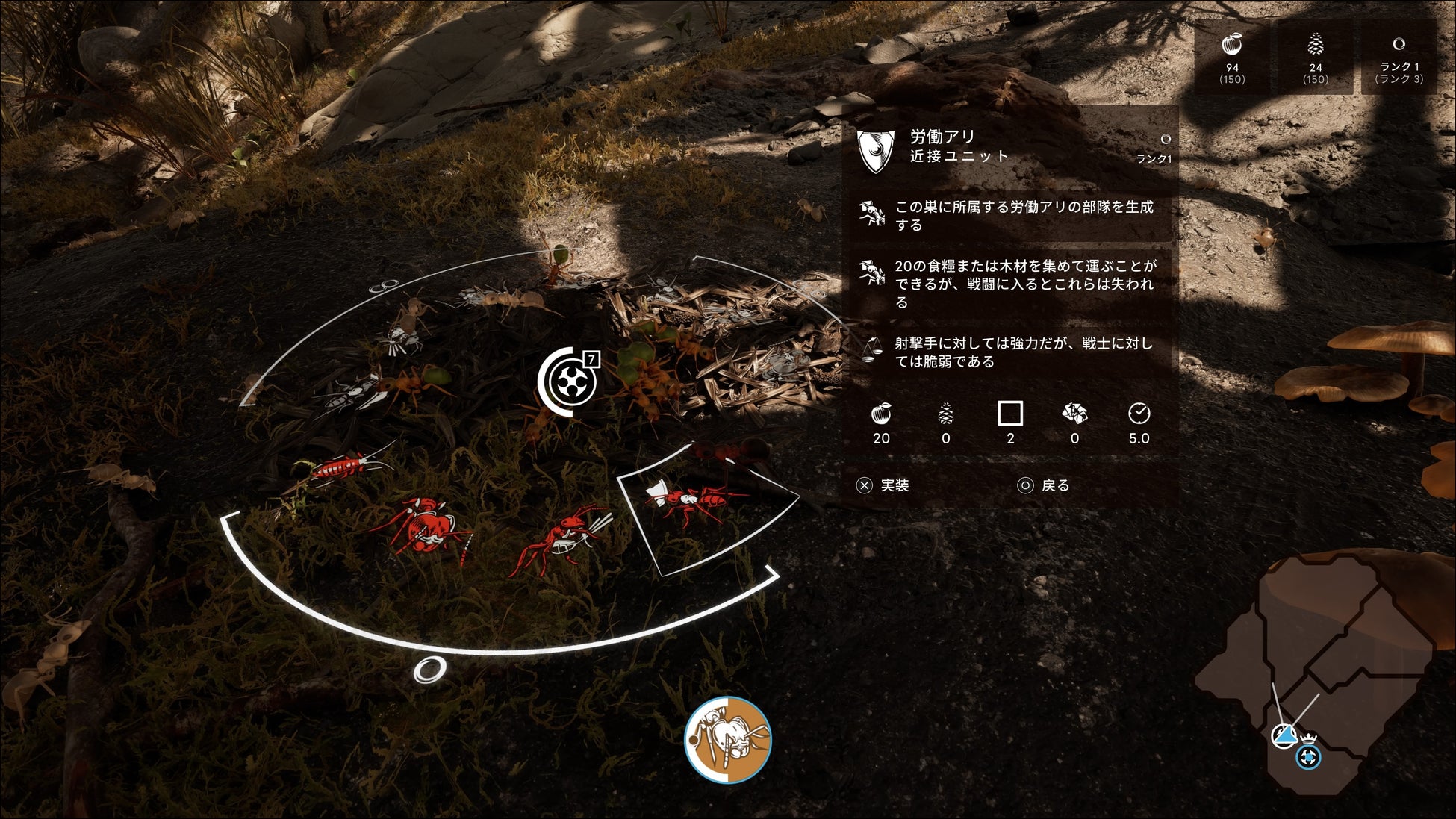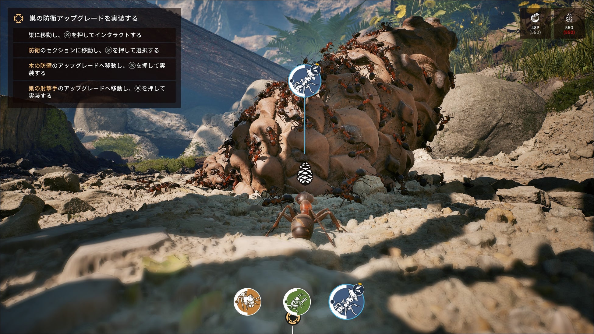 自陣の巣穴では、「部隊」近接やサポートなどを呼び出す/「経済」資源の回収や施設のアップグレード/「防衛」防御兵の配置や施設の建築/「情報」敵拠点や居場所の発見/「パワー」部隊を一時的に強化するフェロモンを覚えるといったセッションで自陣を強化していきます。