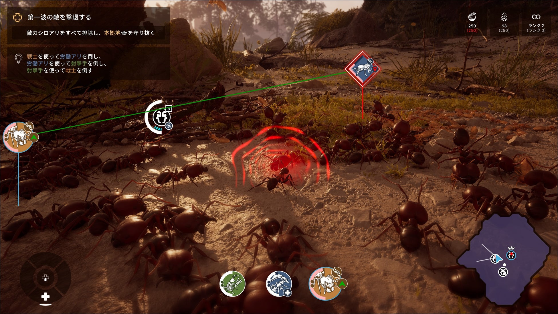 大まかな流れとしては、味方の部隊に指示を出して敵の本拠点を破壊/自陣の本拠点の防衛を行います。自陣の拠点で「!」が表示されているアリに話しかけてミッションを受注します。ミッションには