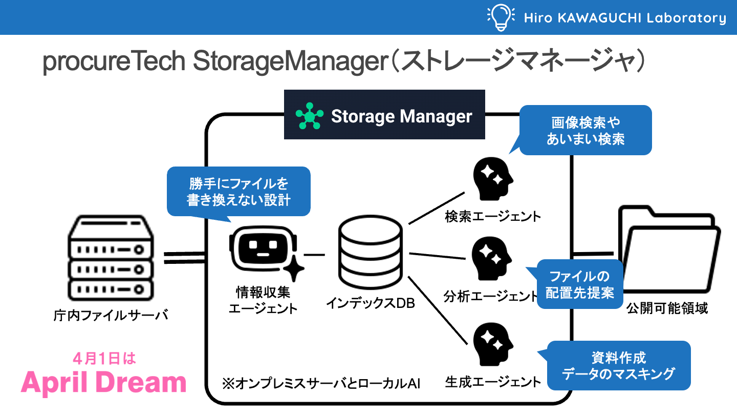 川口弘行合同会社が提供する、自治体向けAIエージェント・ファイル管理支援システム「procureTech StorageManager(ストレージマネージャ) 」 はローカルAIを活用し、庁内に散在する膨大なファイルを自動分析・ 整理し、AIエージェントによる業務改善とデータ利活用を促進するシステムです。
