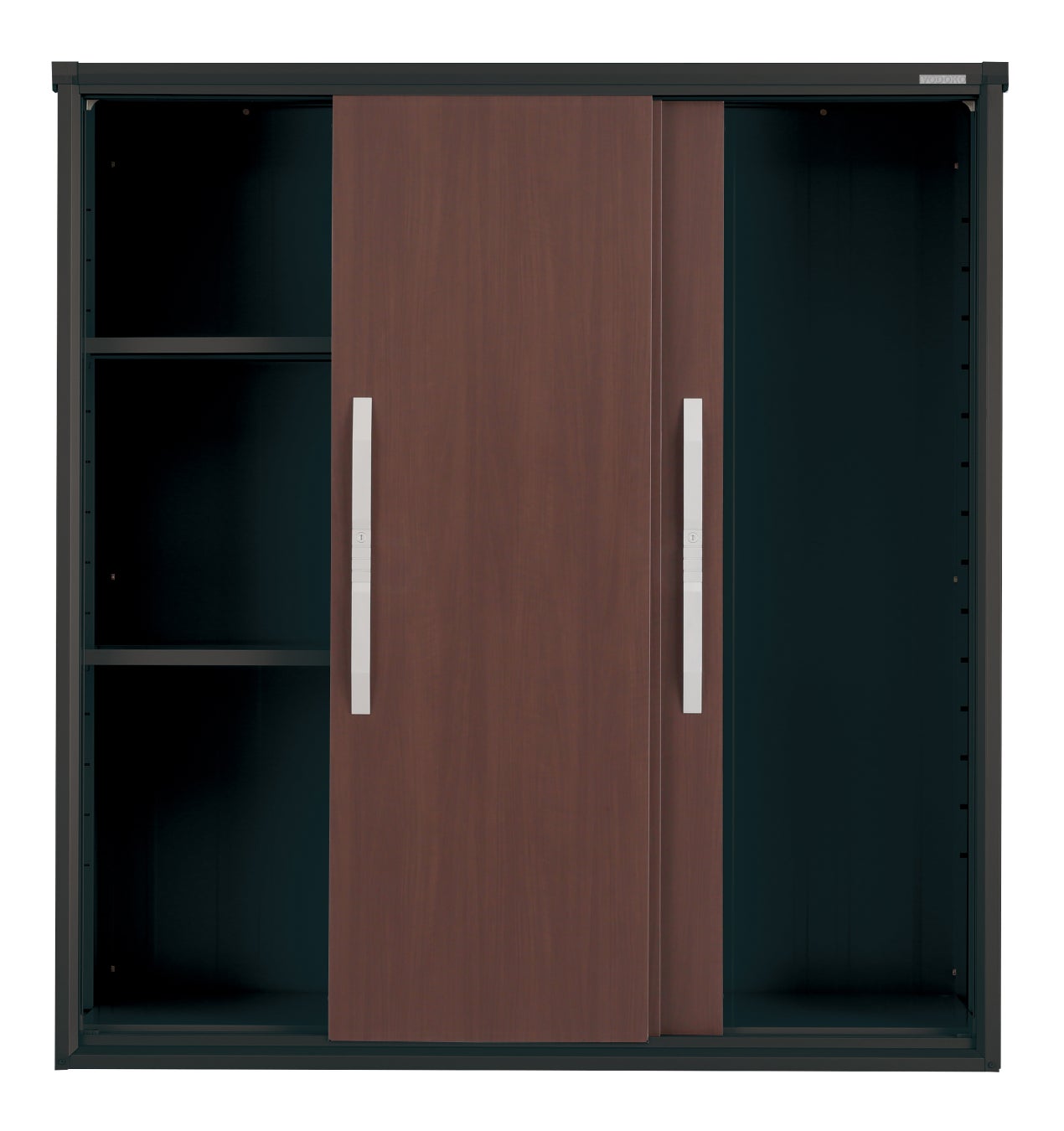 本体色はレザー調の塗装を施したマットな質感のブラック色で、シックな外観に仕上げました。内壁・天井・棚板・棚柱・床の内装もすべてブラック仕様です。大きく開いて出し入れしやすい3枚扉のカラーは、当社の鋼板印刷技術を生かした高級感のある木目調3色と住環境にマッチする落ち着いた3色の全6色からお選びいただけます。扉色「ウッディマロン(WM)」はブラックエスモ限定色です。