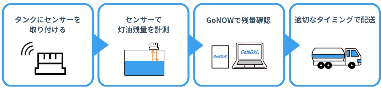 自動発注配送管理システム「GoNOW」は、タンクに設置したIoTデバイスによりエンジンオイルの量を自動計測し、システム上で可視化、一定量まで減ってから配送する仕組みをつくることで、配送の最適化を実現します。