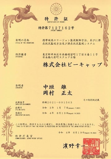 株式会社ビーキャップ(東京都中央区、代表取締役社長 岡村 正太、以下「ビーキャップ」)が提供する屋内位置情報サービス累計導入社数No.1※の「Beacapp Here」は、2022年8月19日にビーコン検知技術に関する特許として、特許第7127162号を取得したことをお知らせ致します。