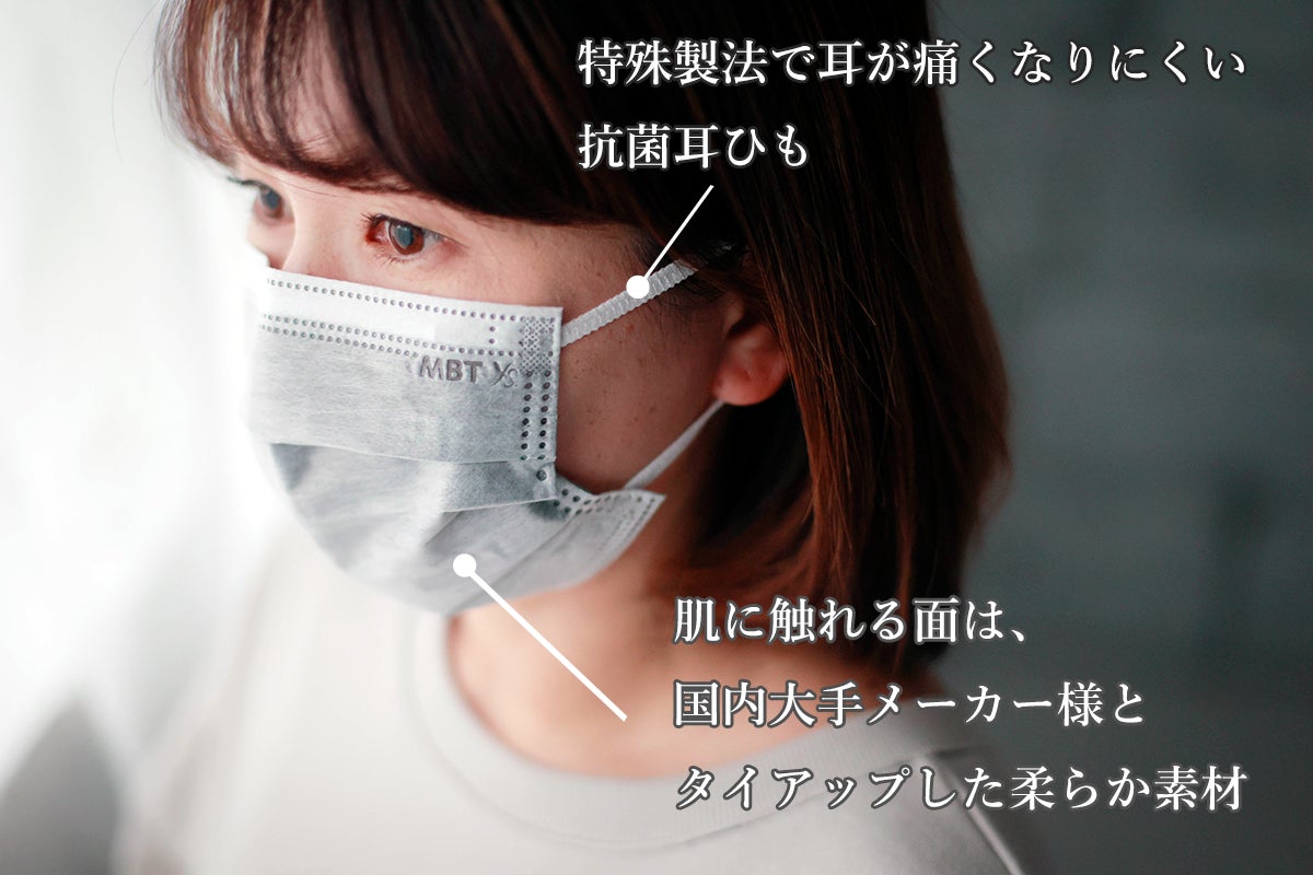 直接素肌に触れる面には柔らかい質感で通気性の良い素材を使用、耳ひもは特殊製法で編み込んでおり長時間着用しても耳が痛くなりにくい出来上がりとなっております。