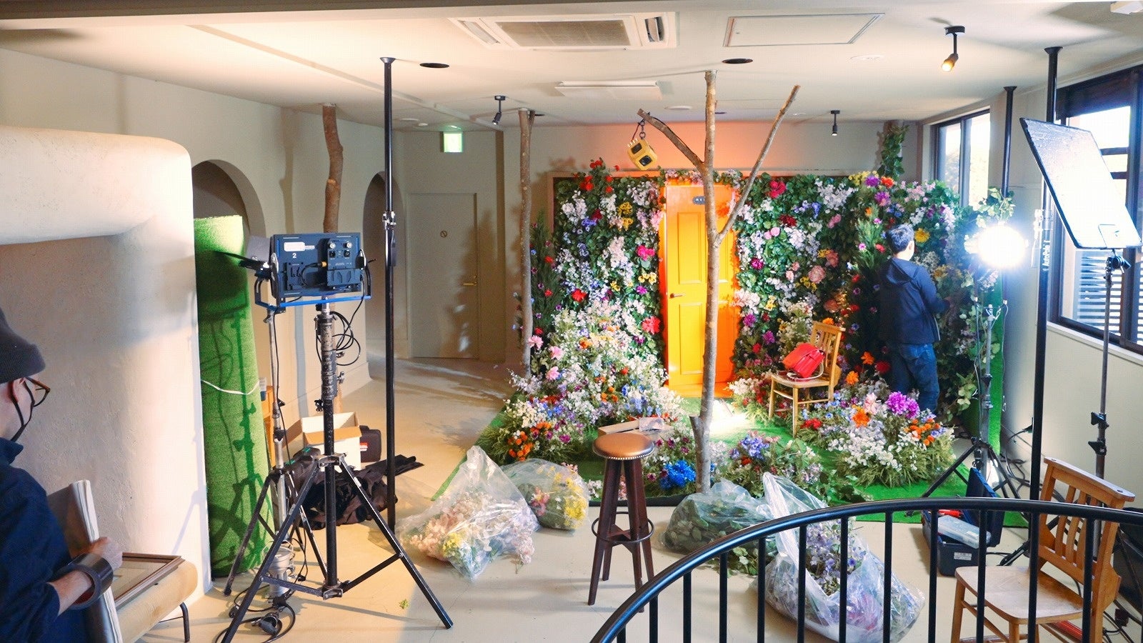 「宿も変わる。」の演出には、僕が旅館という存在への捉え方を宿泊の場所ではなく、スタジオとして使用するという新しい考え方を現実に落とし込み、おやど森の音のフリースペースをファンタジー空間にして撮影しました。